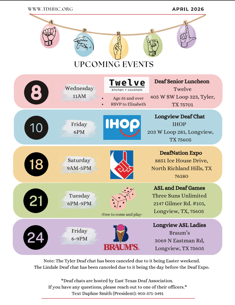 As a nonprofit organization, TDHHC depends on the financial support of our community. Your generosity enables us to provide programs and services to the deaf and hard of hearing community throughout East Texas. Your donations are needed and appreciated by so many. Click here to learn more about donating.
